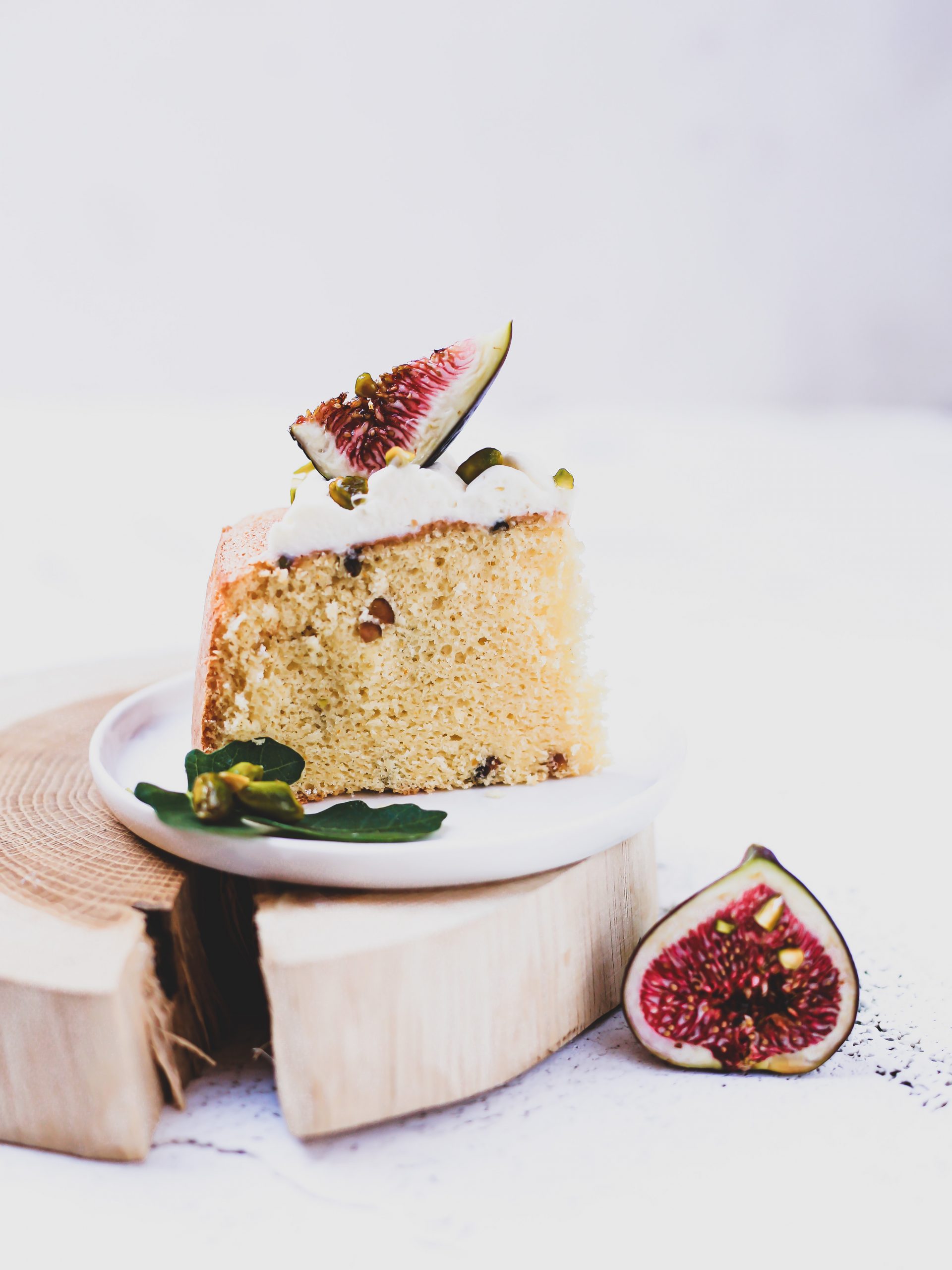 Para decorarlo con el chantilly aérea, este pastel de naranja con flor de azahar e higos frescos debe estar frío. Una vez cubierto el mismo con chantilly, añade los higos previamente cortados y por último los pistachos.